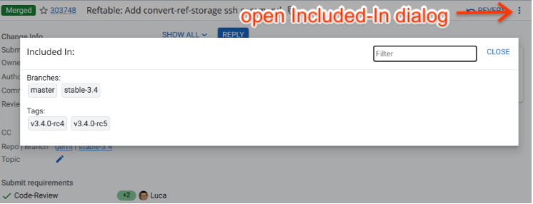 The name of the destination branch is displayed as a link to a list with all changes on this branch that have the same status as the currently viewed change.